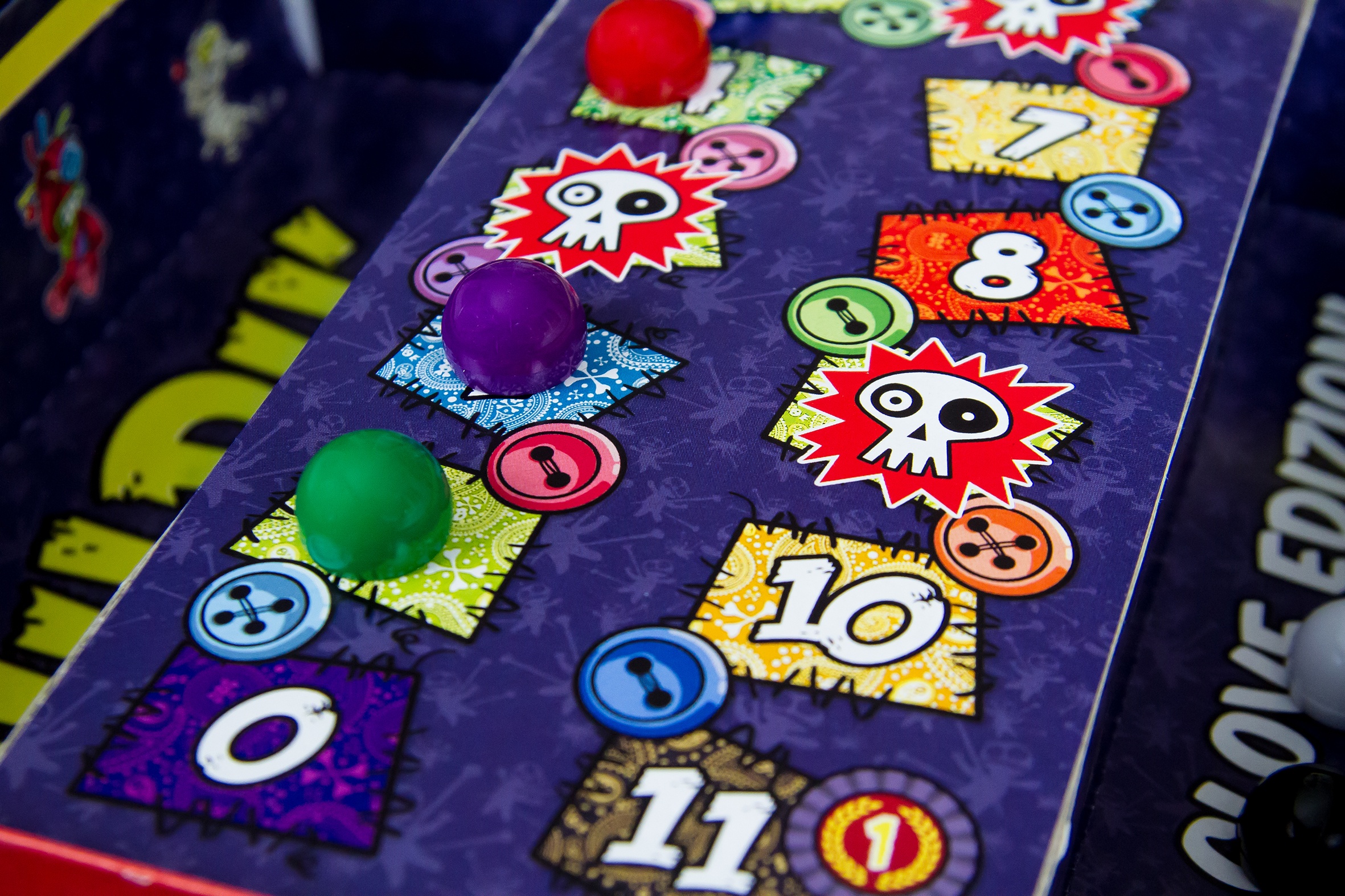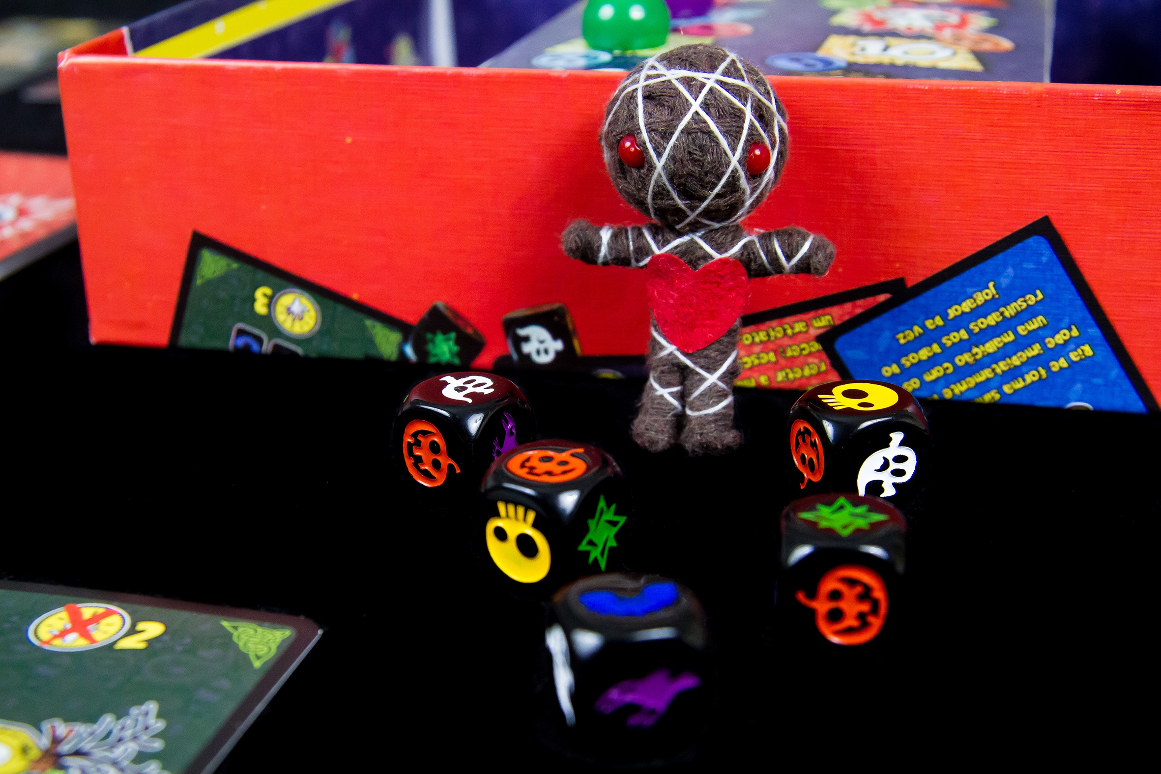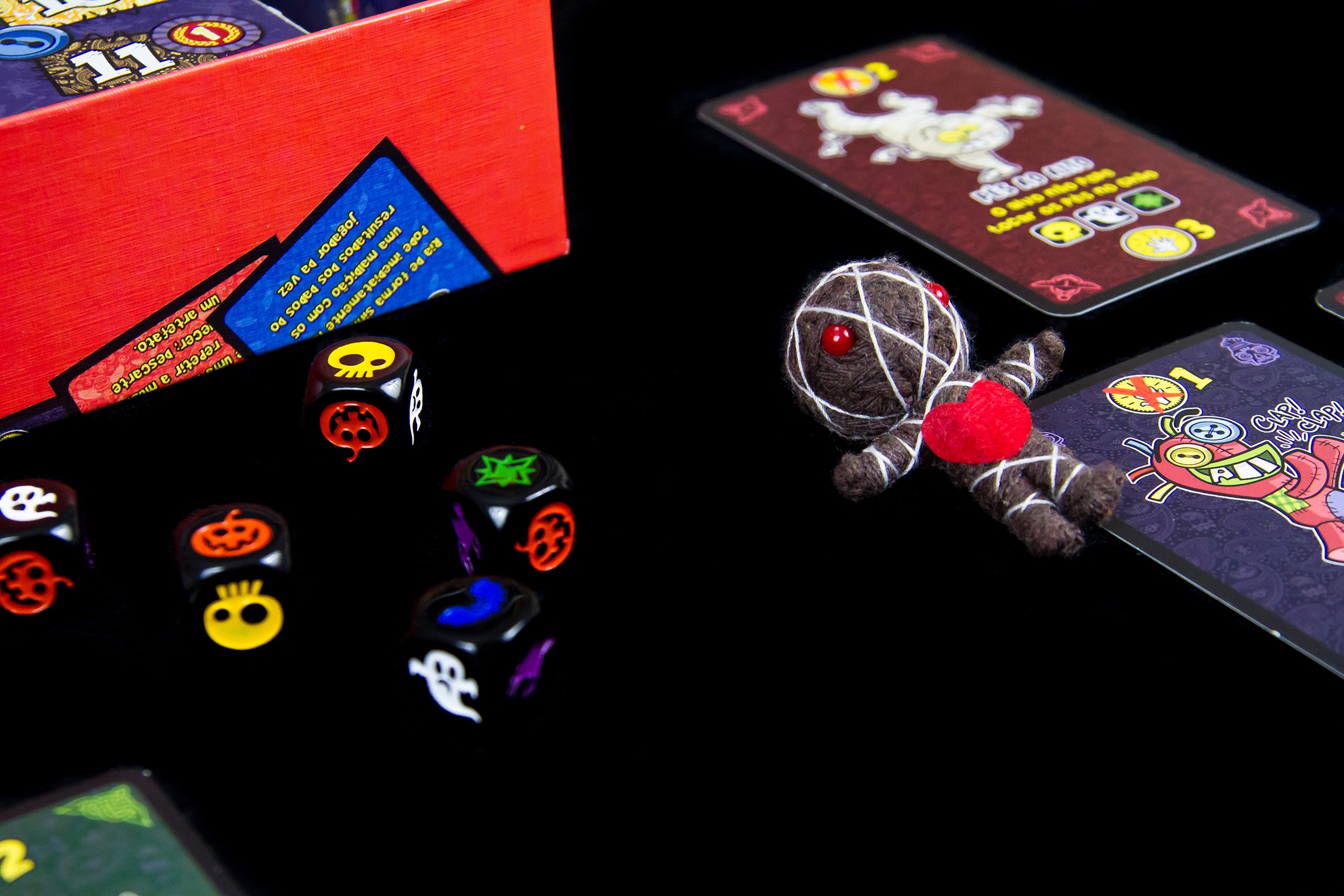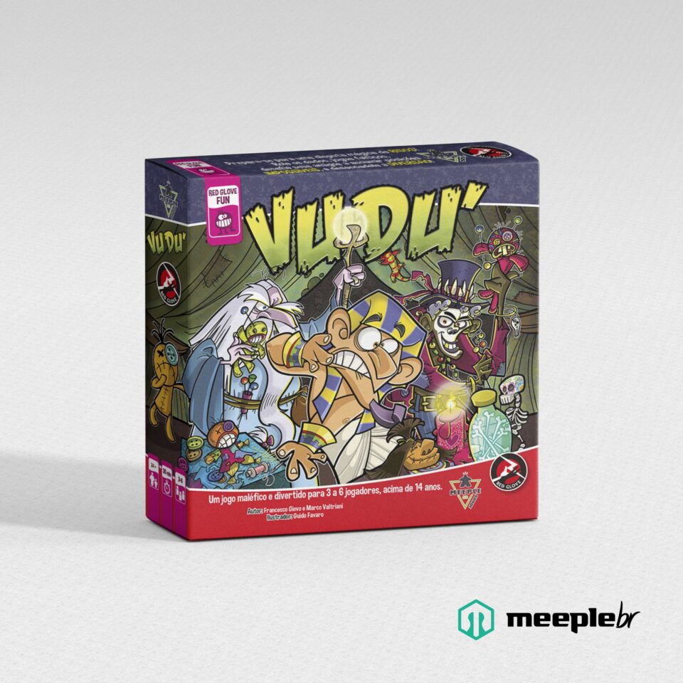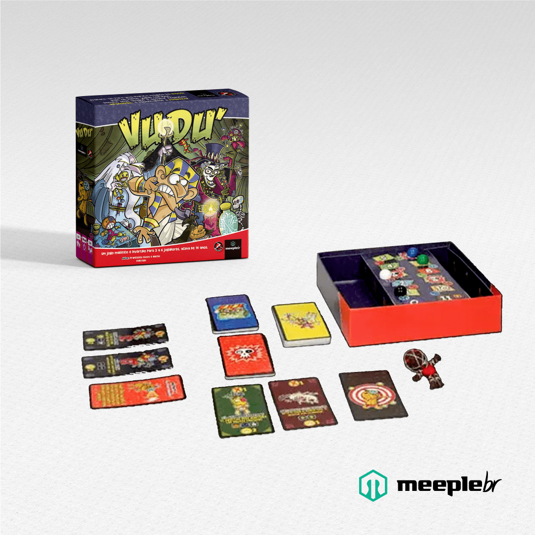 In Vudù, the players act as the most wicked and malicious sorcerers of all time, and they want to use their curses and black magic to make the lives of their enemies impossible to prevail over them! Each turn, you roll five dice, collect your ingredients, then choose whether to take new cards, take new items, or cast a spell. Each spell has a powerful and tricky curse attached to it that forces your target to play in a specific way, for example, talking with his tongue out for the rest of the game, or using only a single hand, or running around the table each turn. Each curse grants you points when you cast it and many more points if your target forgets to obey it or becomes too exhausted to continue. Collect as many malediction points as you can to reach the final tile of the scoreboard before anyone else!