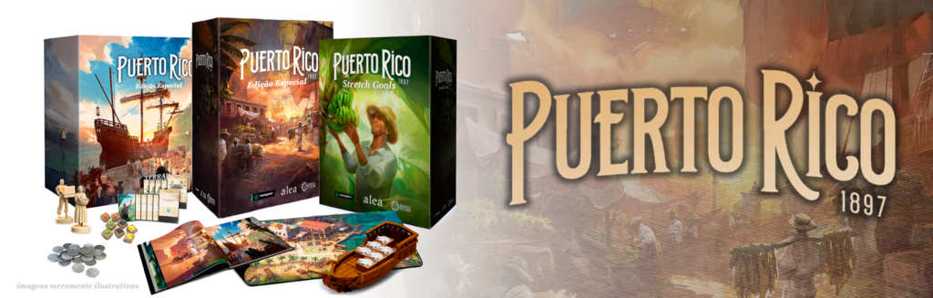 Puerto Rico 1897 – Edição Especial: inclui todos os Stretch Goals desbloqueados e componentes Deluxe da Edição Especial, ou seja, miniaturas de navios e trabalhadores, além de outras melhorias premium.