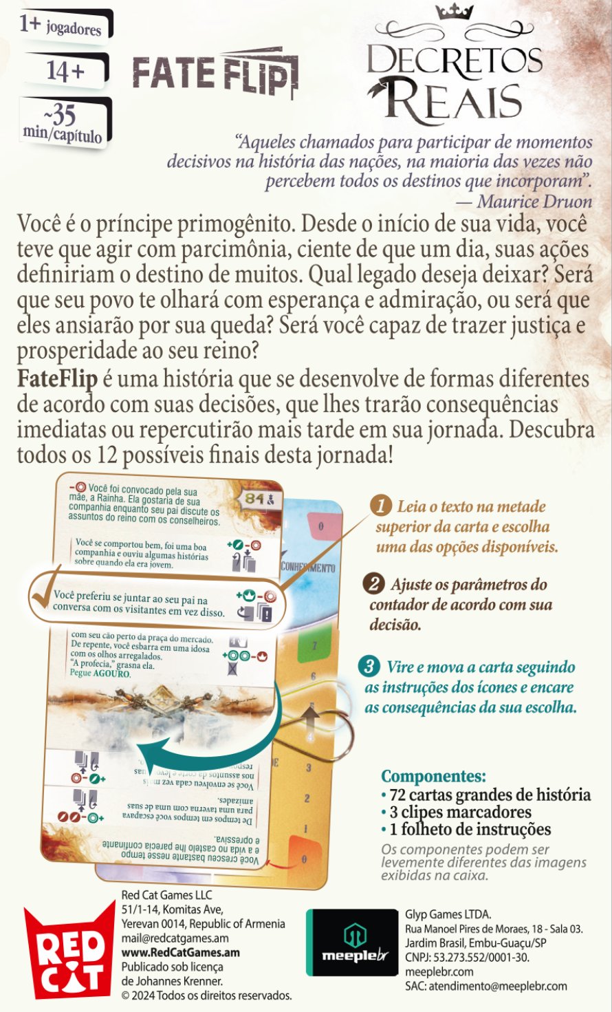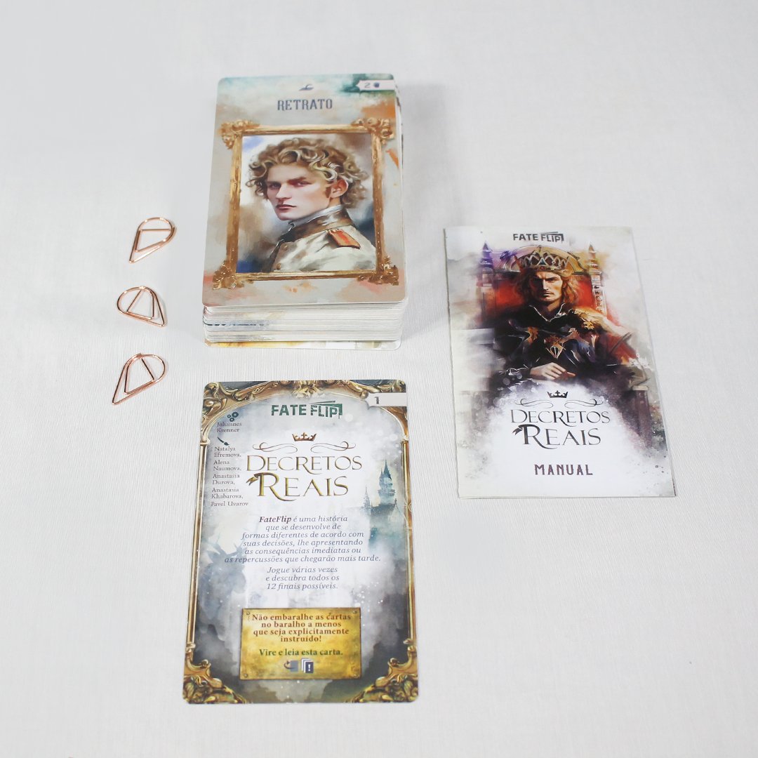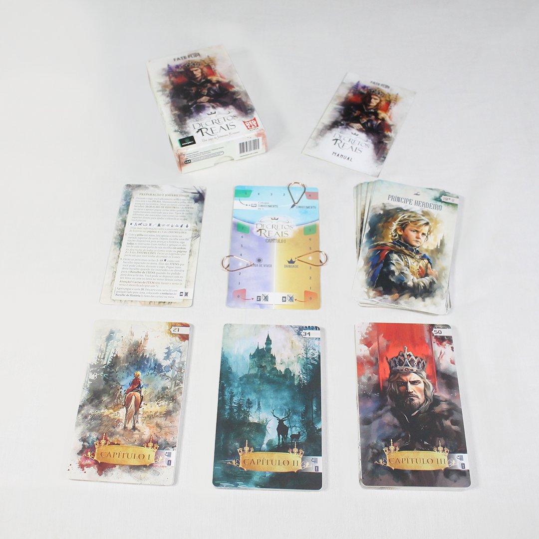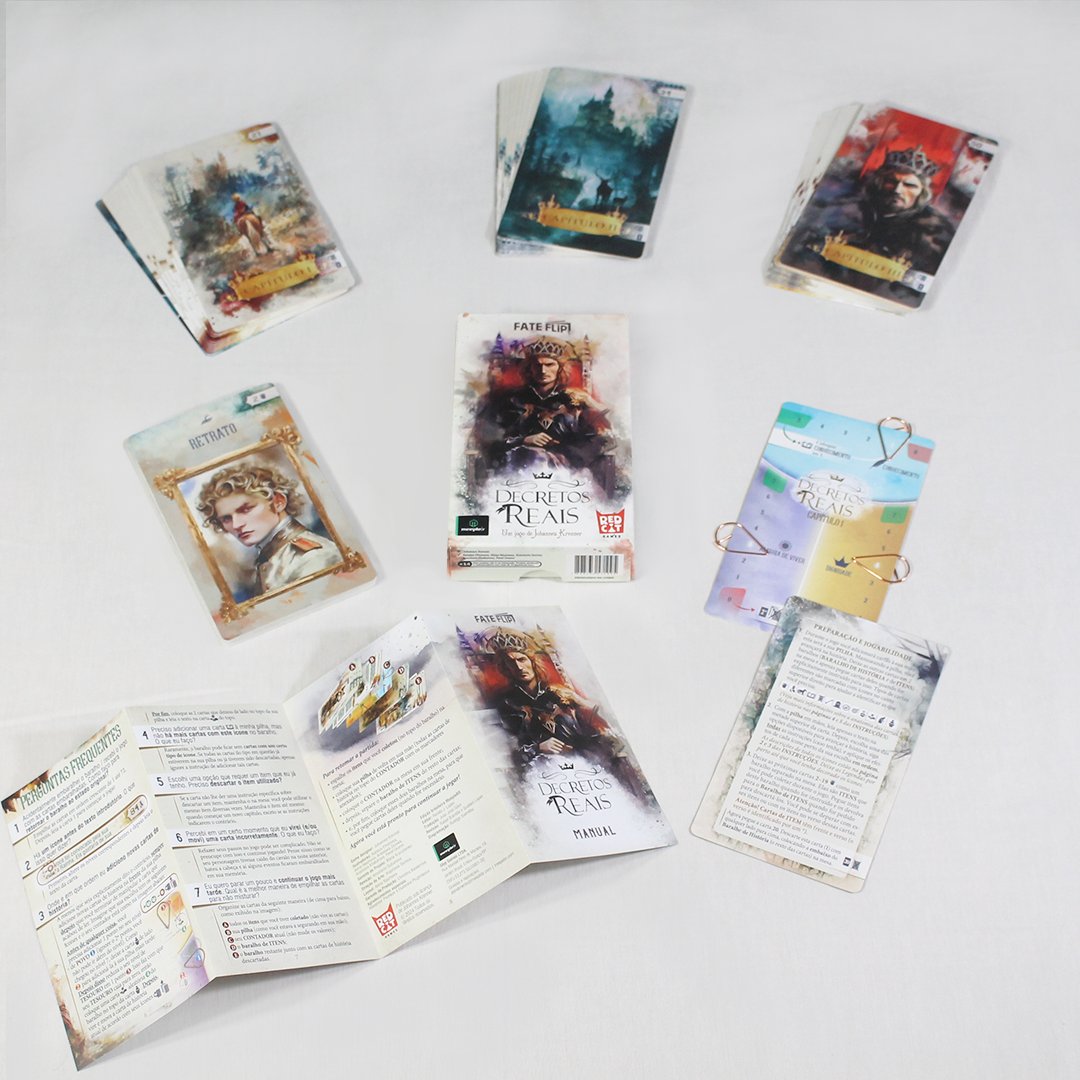 FateFlip: Decretos Reais é uma aventura solo, baseada em história na qual o jogador assume o papel do personagem principal do jogo. Aqui você é o príncipe primogênito. Desde os seus primeiros anos de vida, teve que observar cuidadosamente suas ações, sabendo que um dia moldaria o destino de muitos.
