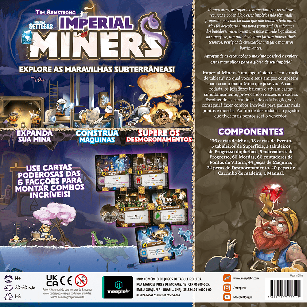 Em Imperial Miners o seu objetivo é ser o melhor Minerador Imperial de toda a terra e, para conseguir isso, você precisa ganhar mais Pontos de Vitória que os outros jogadores, baixando cartas de acordo com cada nível da mina e ativando a que você baixou e as que estão acima dela. A partida se desenrola em 10 rodadas e, no final, o jogador com mais Pontos de Vitória será o vencedor.