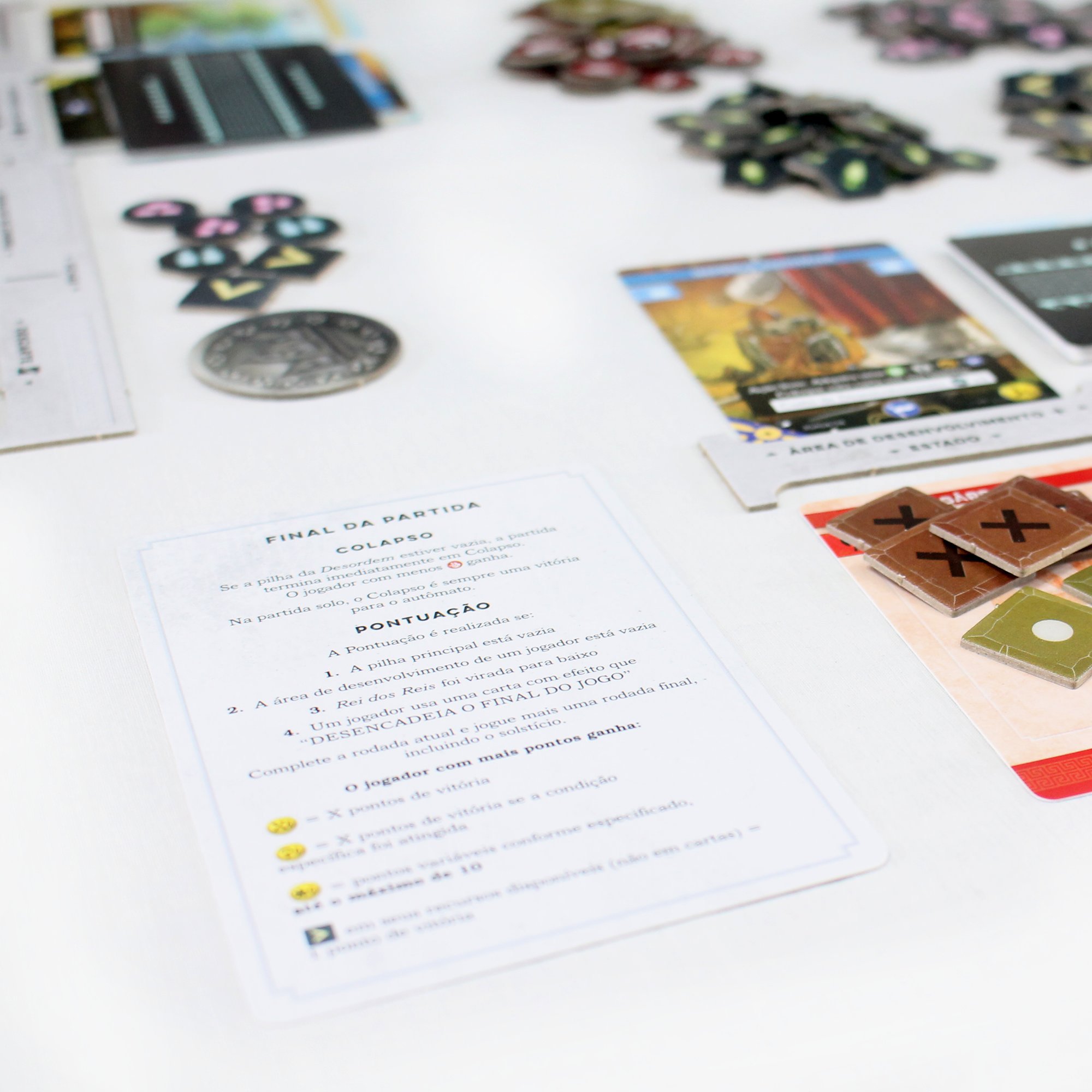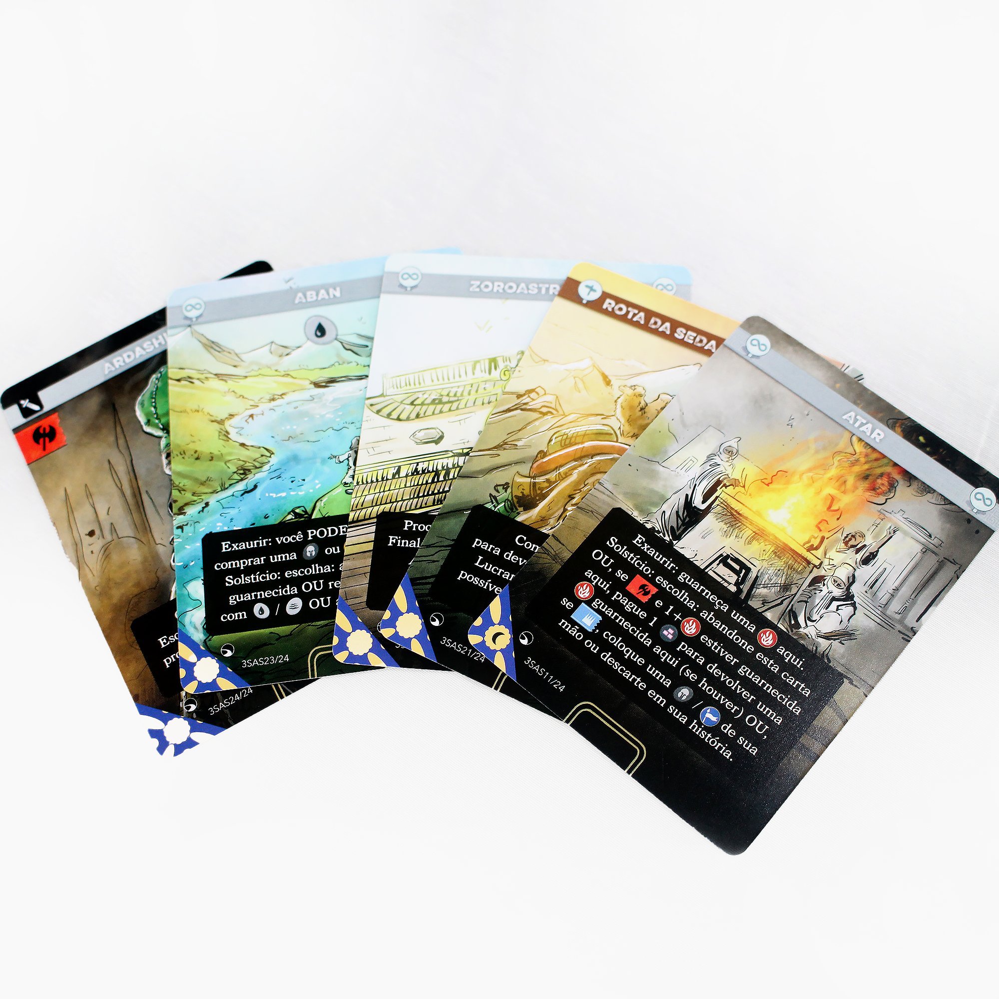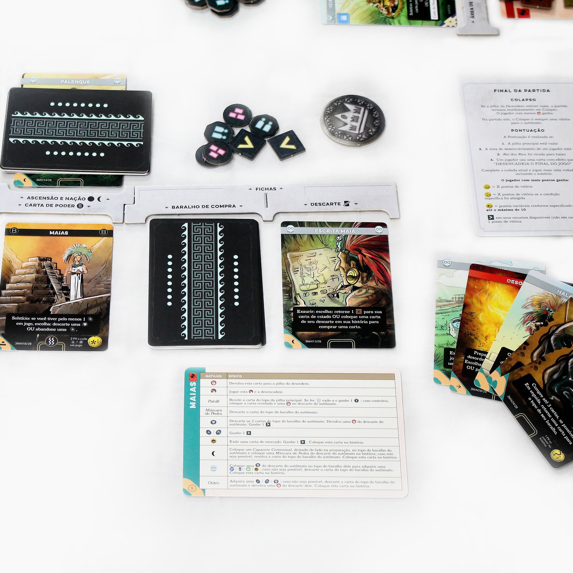 O jogo contém cartas de tamanho padrão, 63.5 mm X 88 mm, e tamanho 80 mm X 120 mm.