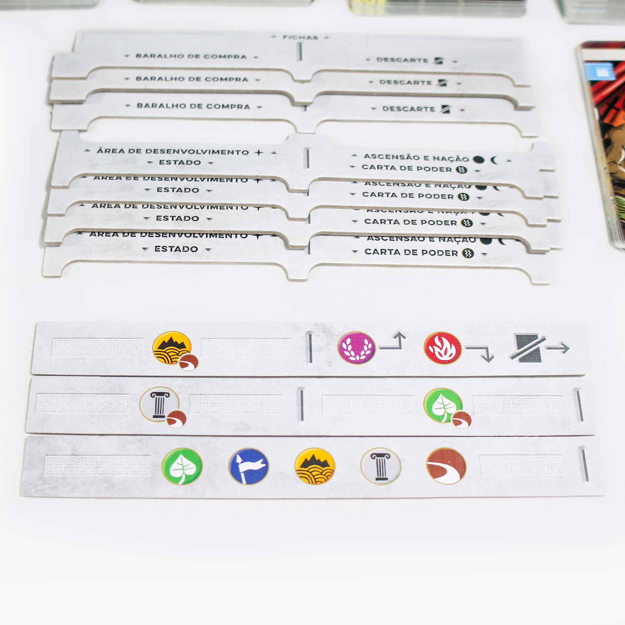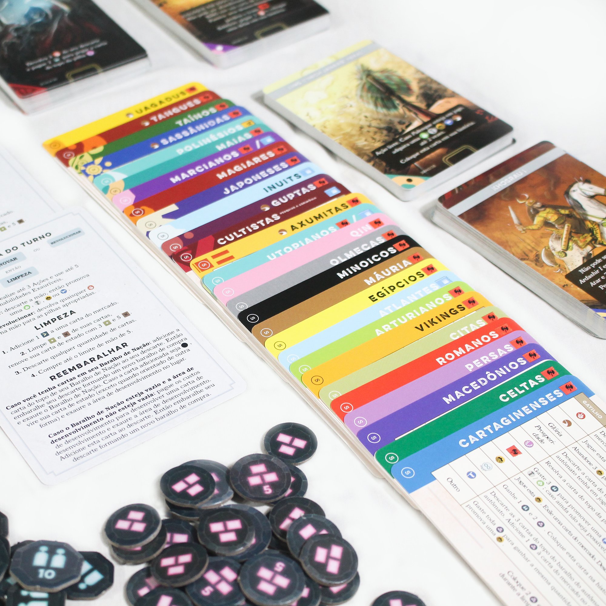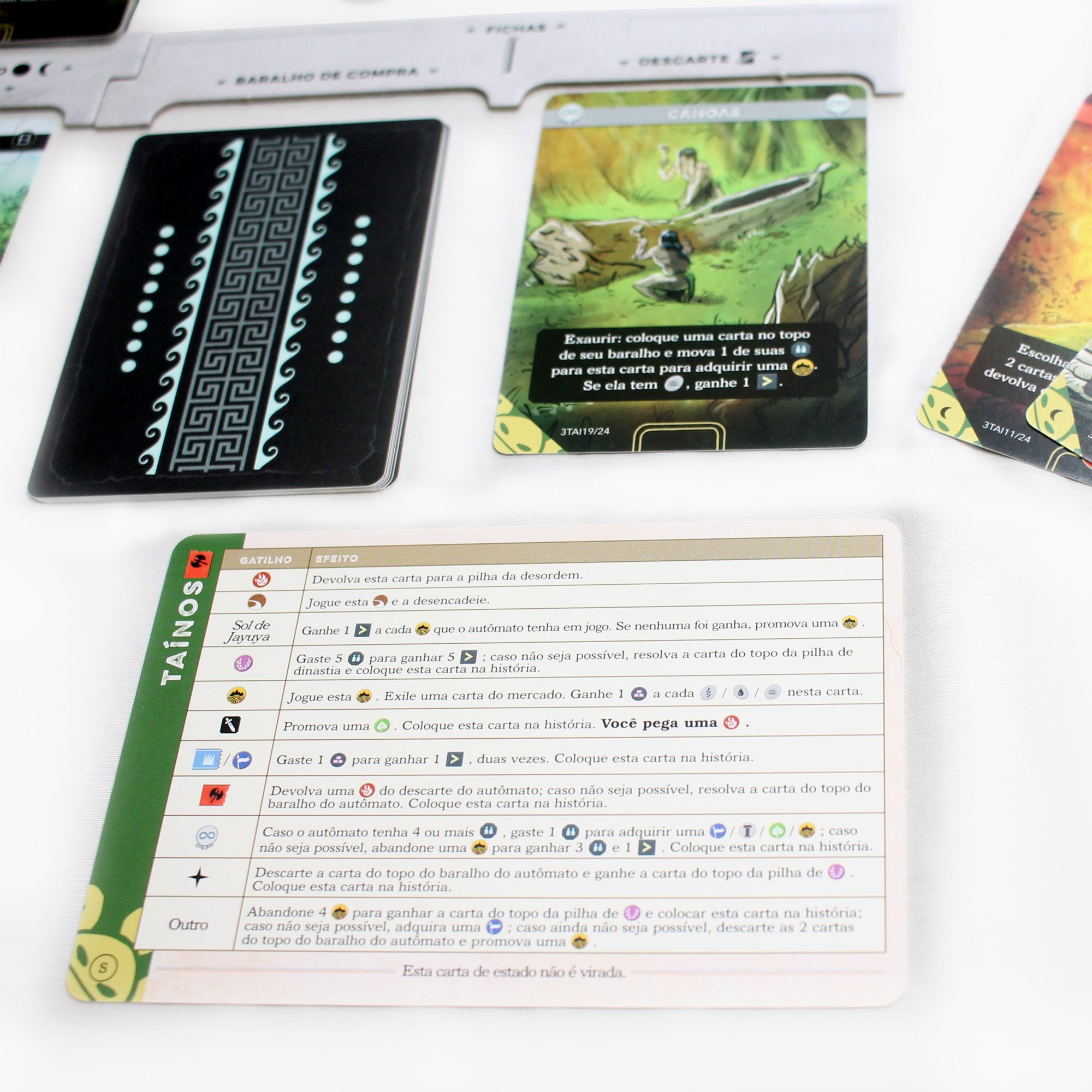 O jogo contém cartas de tamanho padrão, 63.5 mm X 88 mm, e tamanho 80 mm X 120 mm.