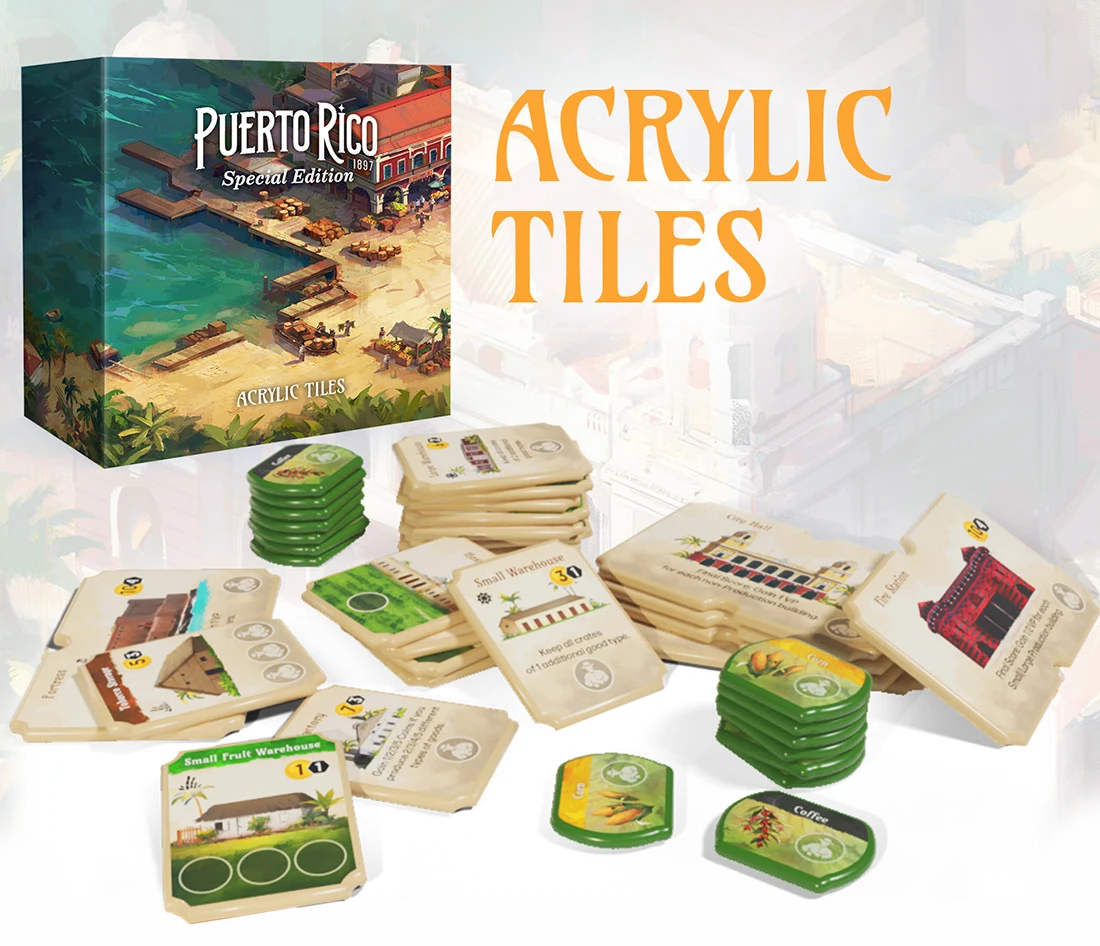O conjunto extra de peças de acrílico de alta qualidade atende todo o conteúdo da Edição Especial e Metas Estendidas desbloqueadas da coleção Puerto Rico 1897. As peças vêm com texto em inglês.