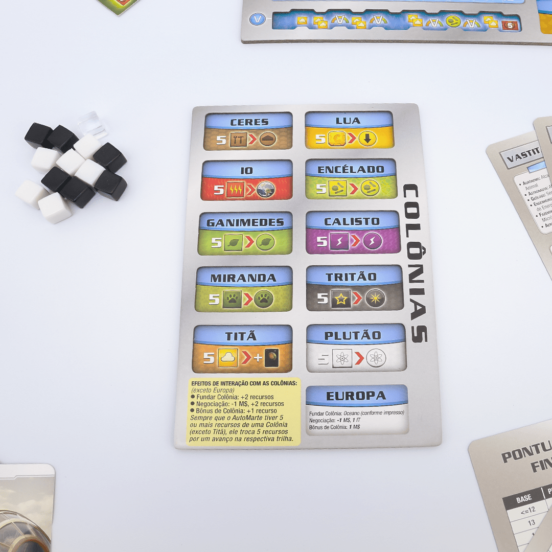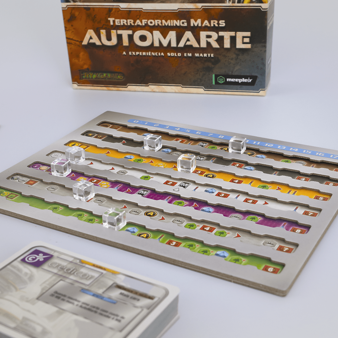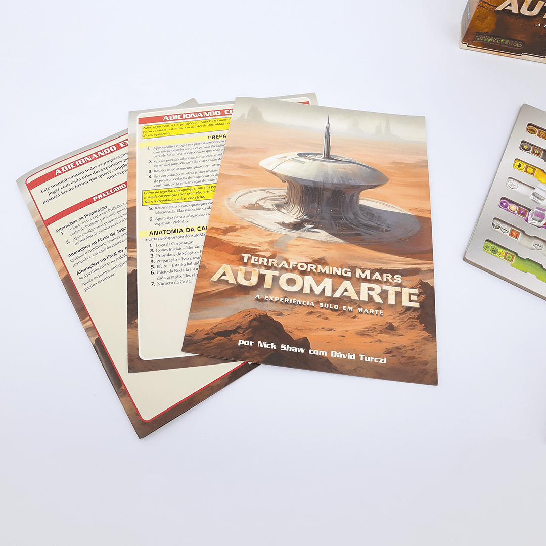 Terraforming Mars: AutoMarte fornece uma nova experiência solo quando jogar Terraforming Mars. No lugar de correr contra o relógio, o AutoMarte o permite competir contra corporações controladas por algoritmos e cartas especiais, possibilitando adicionar qualquer expansão para criar o desafio que você procura!