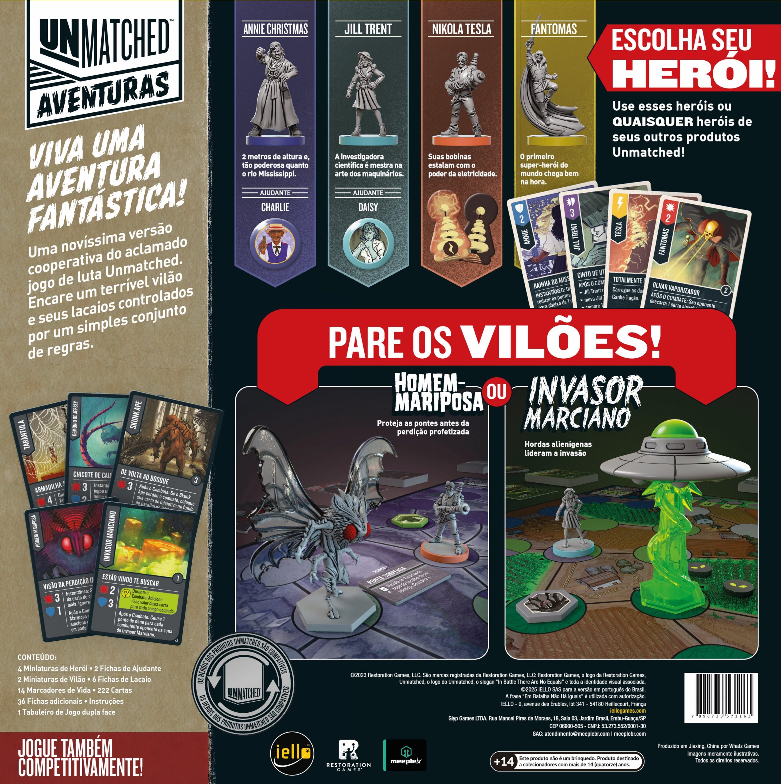 Unmatched Aventuras: Contos Fantásticos é um jogo independente que usa as regras básicas e os heróis de Unmatched de um jeito completamente diferente. Usando essas regras cooperativas, até quatro heróis trabalharão juntos para derrotar um vilão controlado pelo jogo. Você pode usar os heróis desta caixa ou misturar os heróis de quaisquer outros produtos da linha Unmatched (você também pode usar os heróis desta caixa em partidas competitivas de Unmatched!).