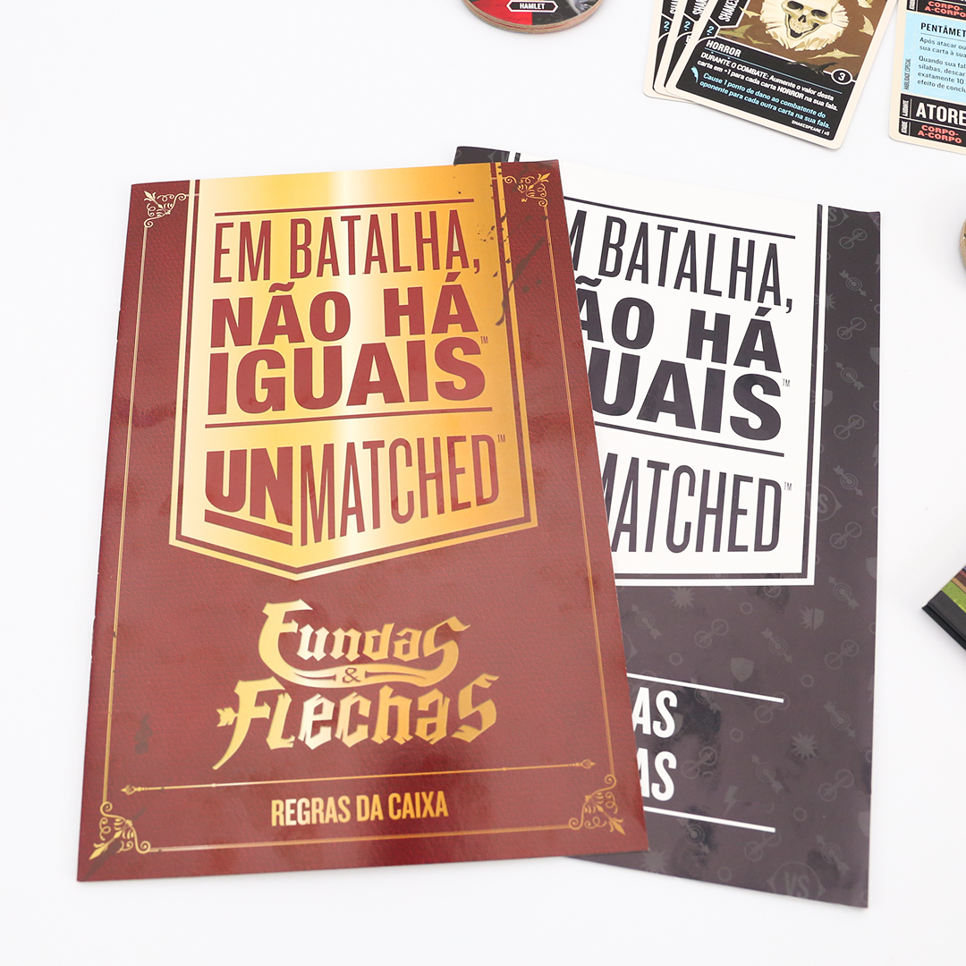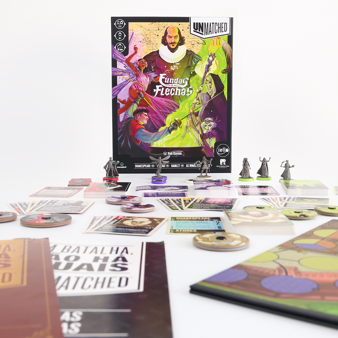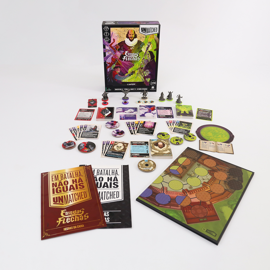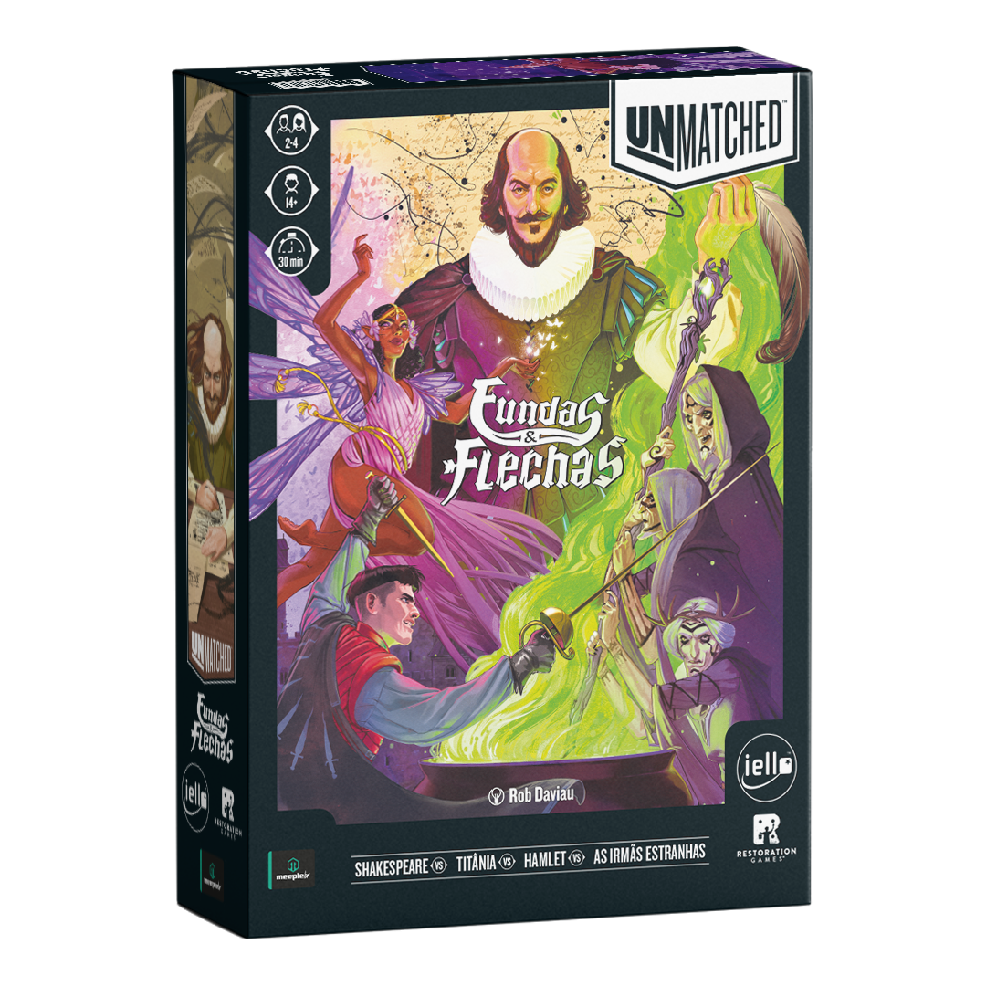 O mundo inteiro é um palco em Unmatched: Fundas e Flechas, enquanto o Globe Theatre é um campo de batalha. William Shakespeare entra na luta junto com três de seus personagens maravilhosos: As Irmãs Estranhas, Hamlet e Titânia. O baralho de Shakespeare, criado por Jonathan Guberman, foi um dos baralhos vencedores em uma competição de design de 2020 e recompensa os jogadores por completarem linhas em pentâmetro iâmbico. O baralho d’As Irmãs Estranhas, vice-campeão nessa competição de Jason Hager, é um deck multi-herói que desafia você a dar vida às maquinações de poções das bruxas com uma coordenação astuta.