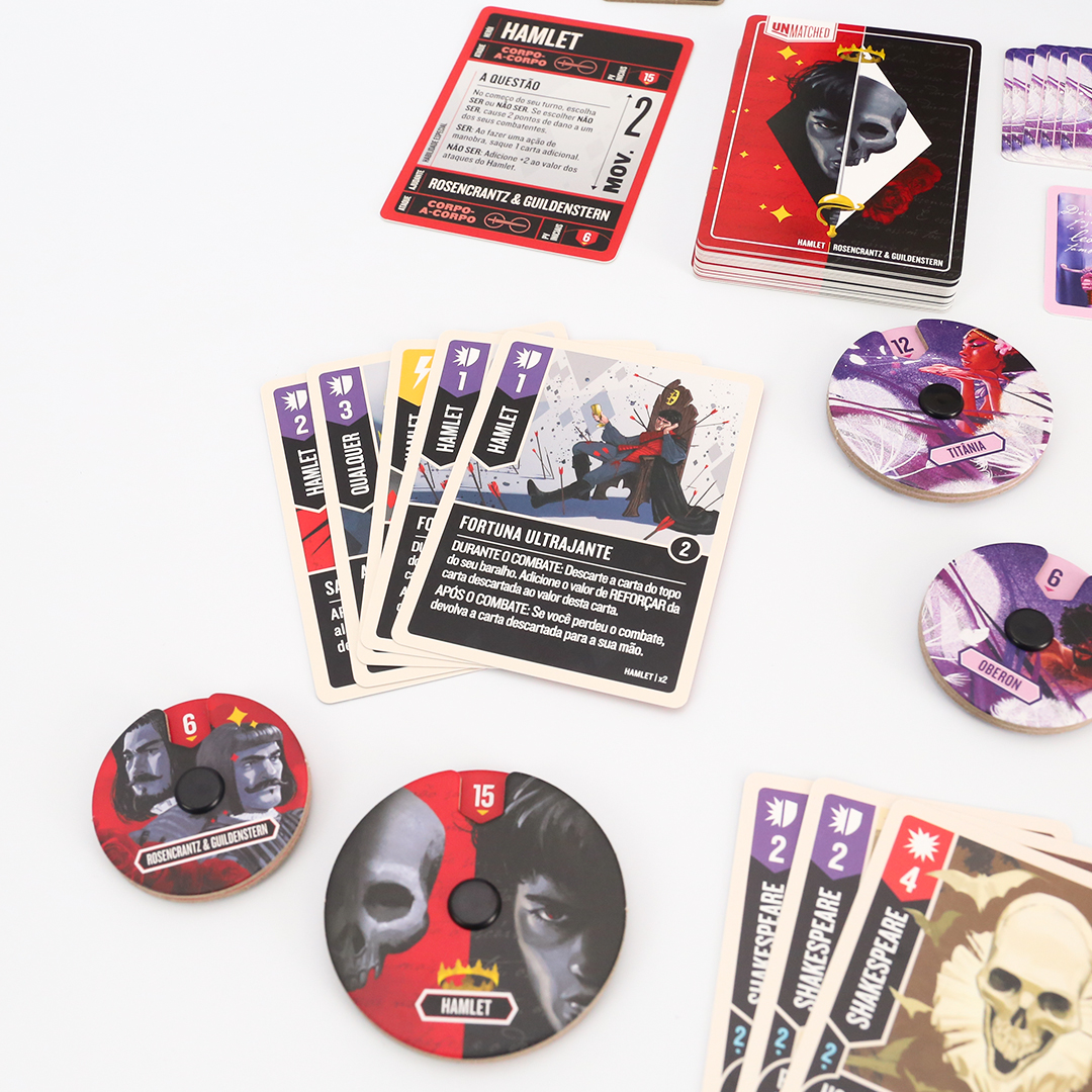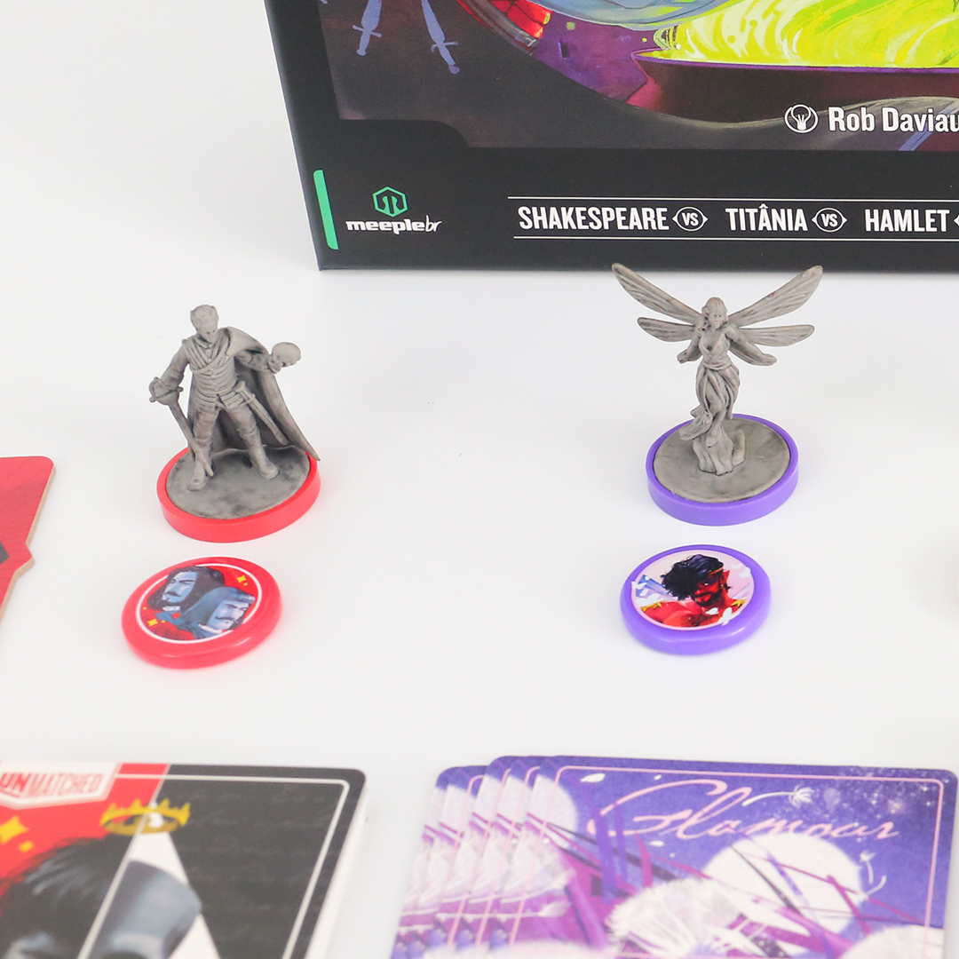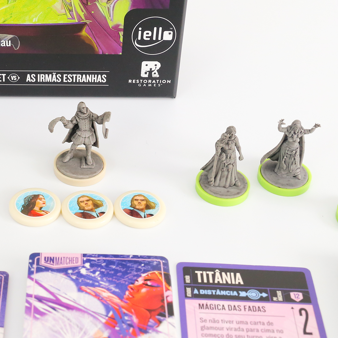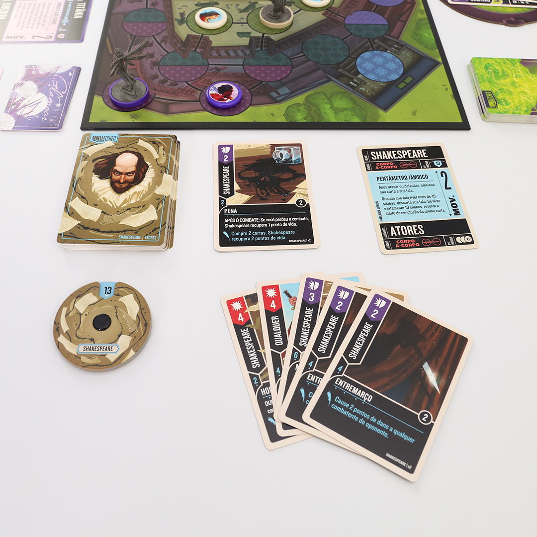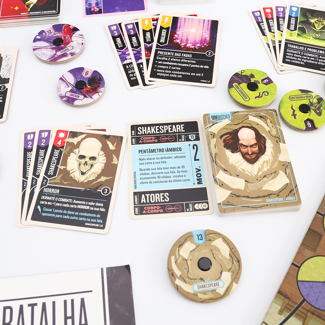 O mundo inteiro é um palco em Unmatched: Fundas e Flechas, enquanto o Globe Theatre é um campo de batalha. William Shakespeare entra na luta junto com três de seus personagens maravilhosos: As Irmãs Estranhas, Hamlet e Titânia. O baralho de Shakespeare, criado por Jonathan Guberman, foi um dos baralhos vencedores em uma competição de design de 2020 e recompensa os jogadores por completarem linhas em pentâmetro iâmbico. O baralho d’As Irmãs Estranhas, vice-campeão nessa competição de Jason Hager, é um deck multi-herói que desafia você a dar vida às maquinações de poções das bruxas com uma coordenação astuta.