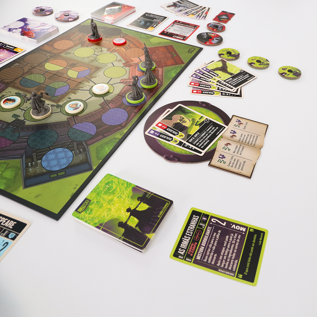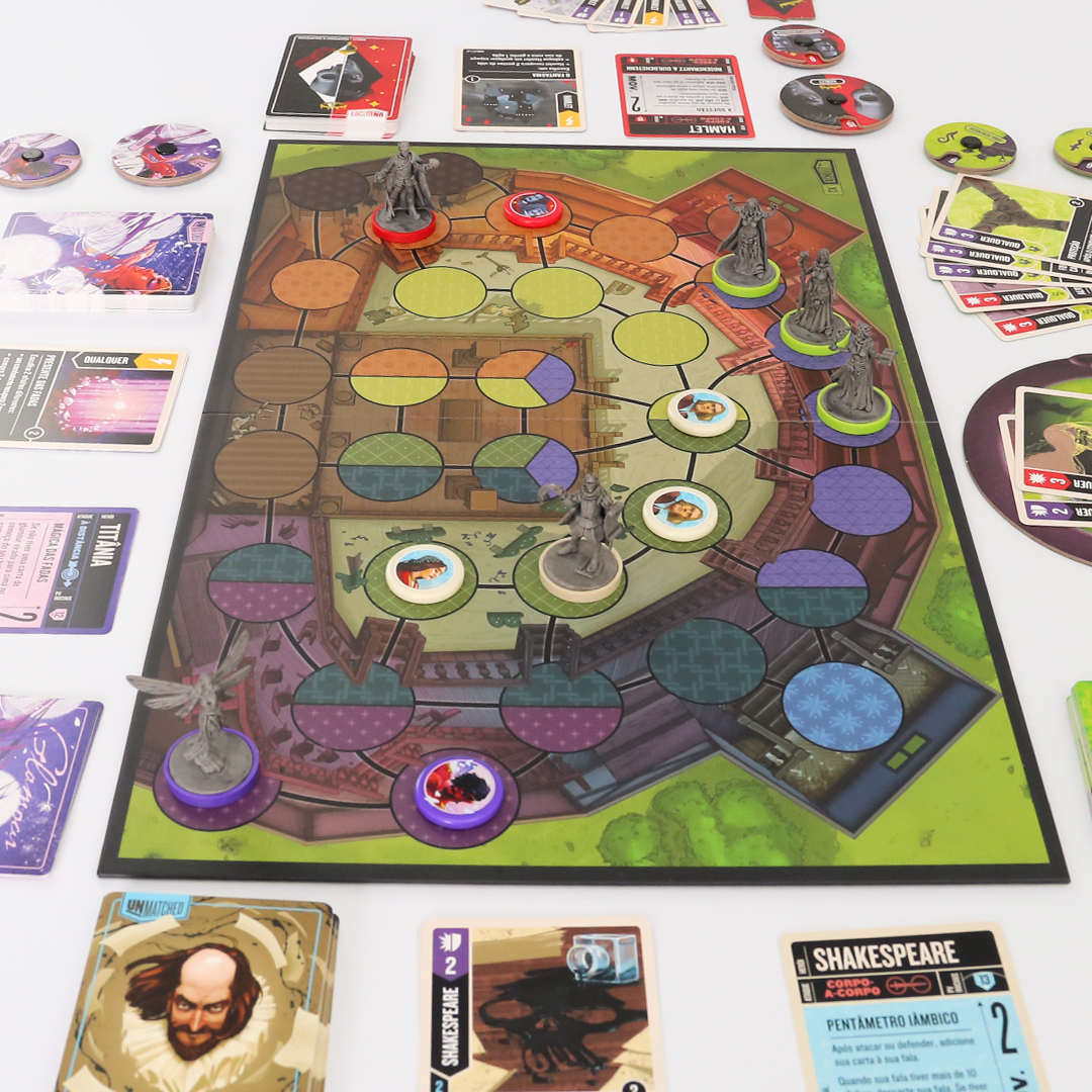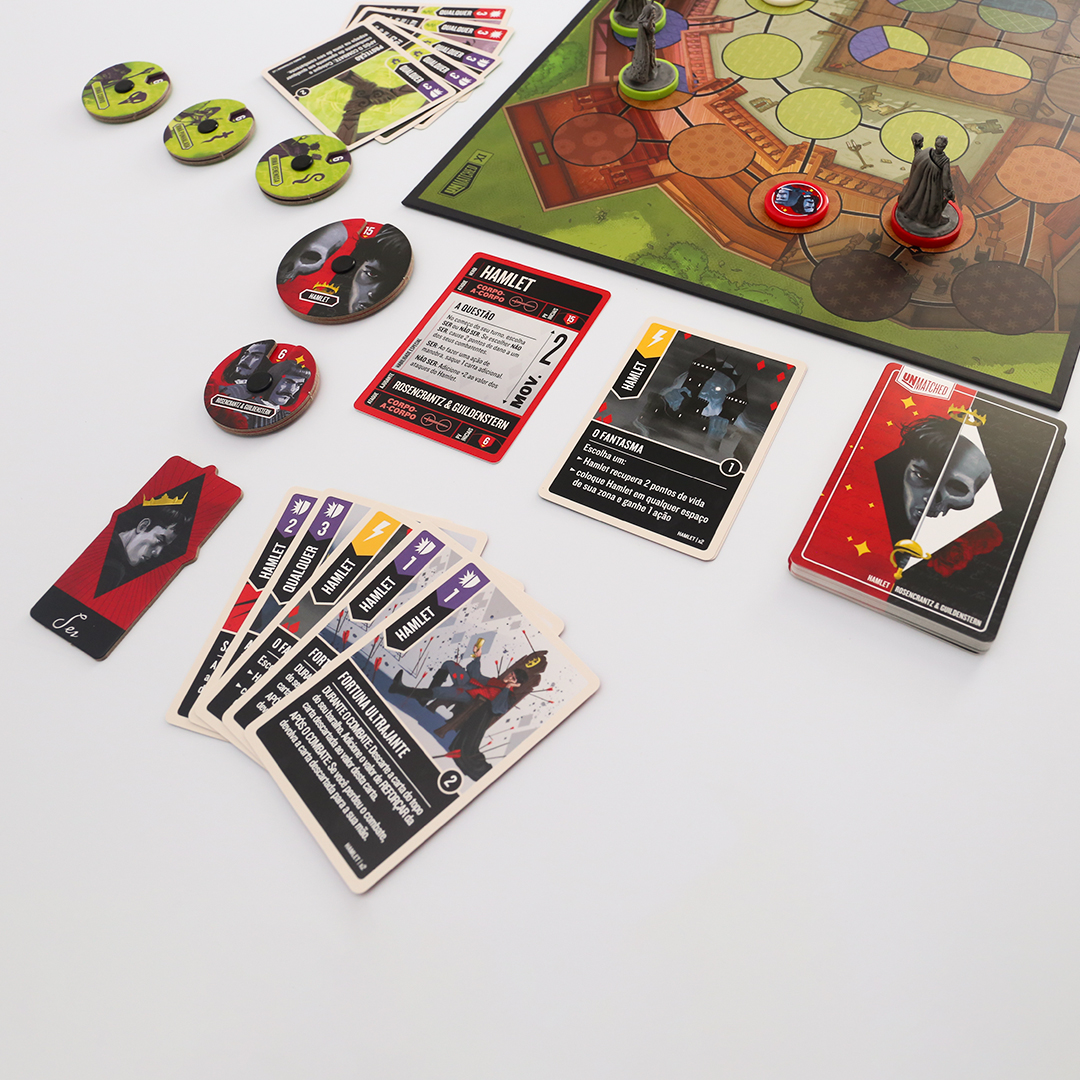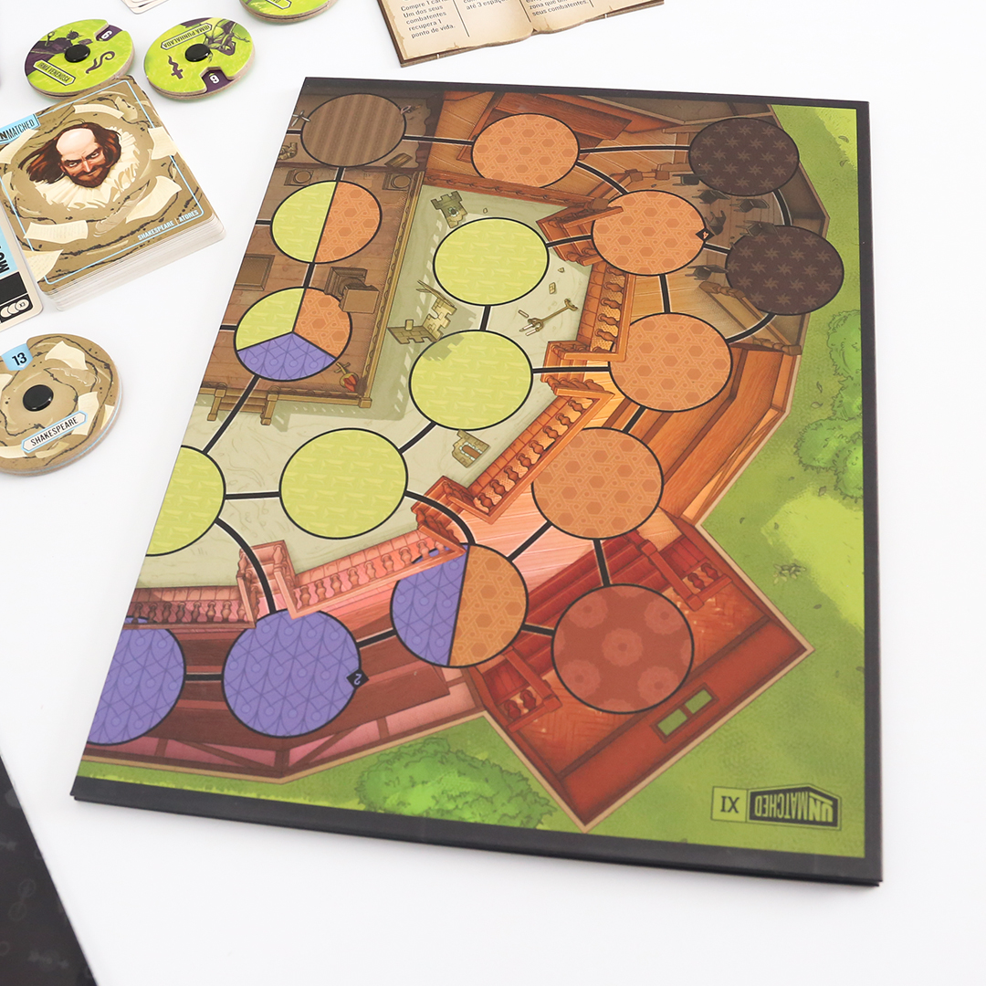 O mundo inteiro é um palco em Unmatched: Fundas e Flechas, enquanto o Globe Theatre é um campo de batalha. William Shakespeare entra na luta junto com três de seus personagens maravilhosos: As Irmãs Estranhas, Hamlet e Titânia. O baralho de Shakespeare, criado por Jonathan Guberman, foi um dos baralhos vencedores em uma competição de design de 2020 e recompensa os jogadores por completarem linhas em pentâmetro iâmbico. O baralho d’As Irmãs Estranhas, vice-campeão nessa competição de Jason Hager, é um deck multi-herói que desafia você a dar vida às maquinações de poções das bruxas com uma coordenação astuta.