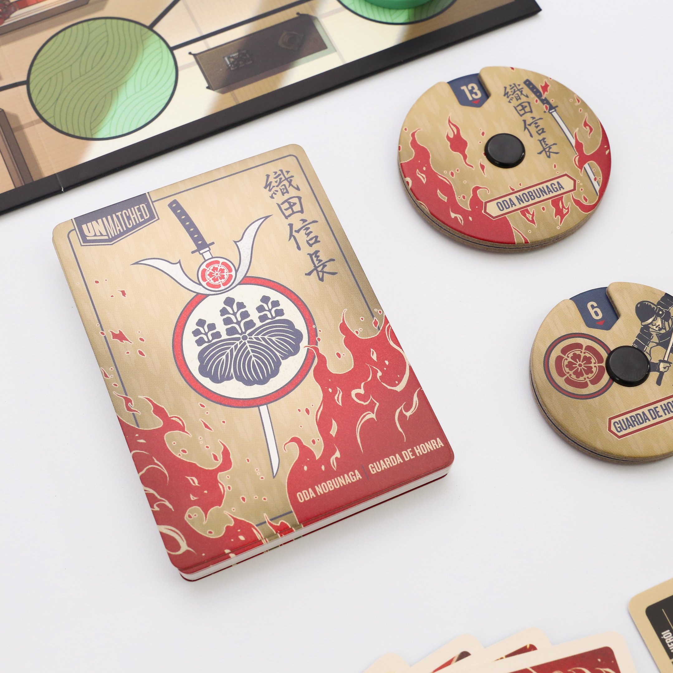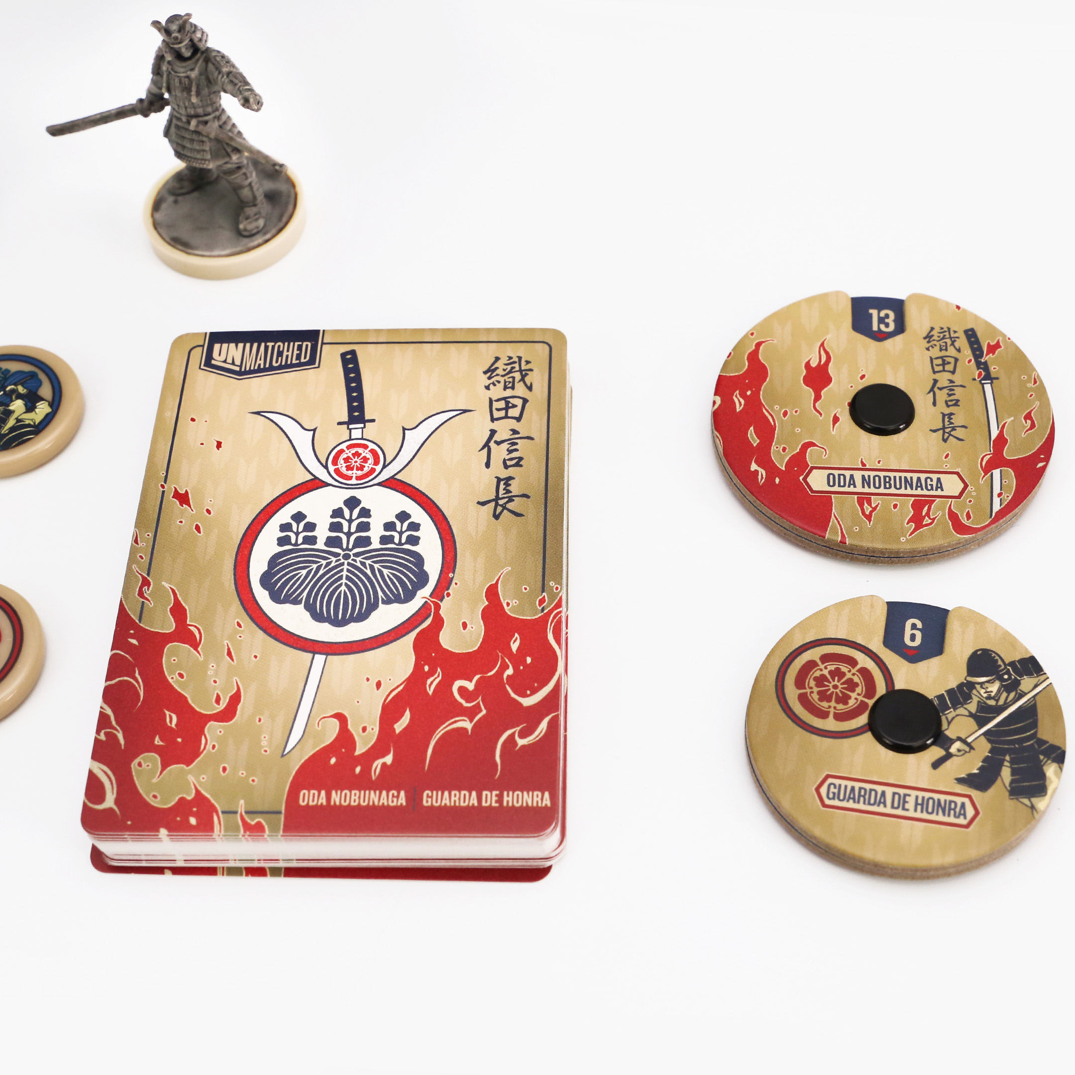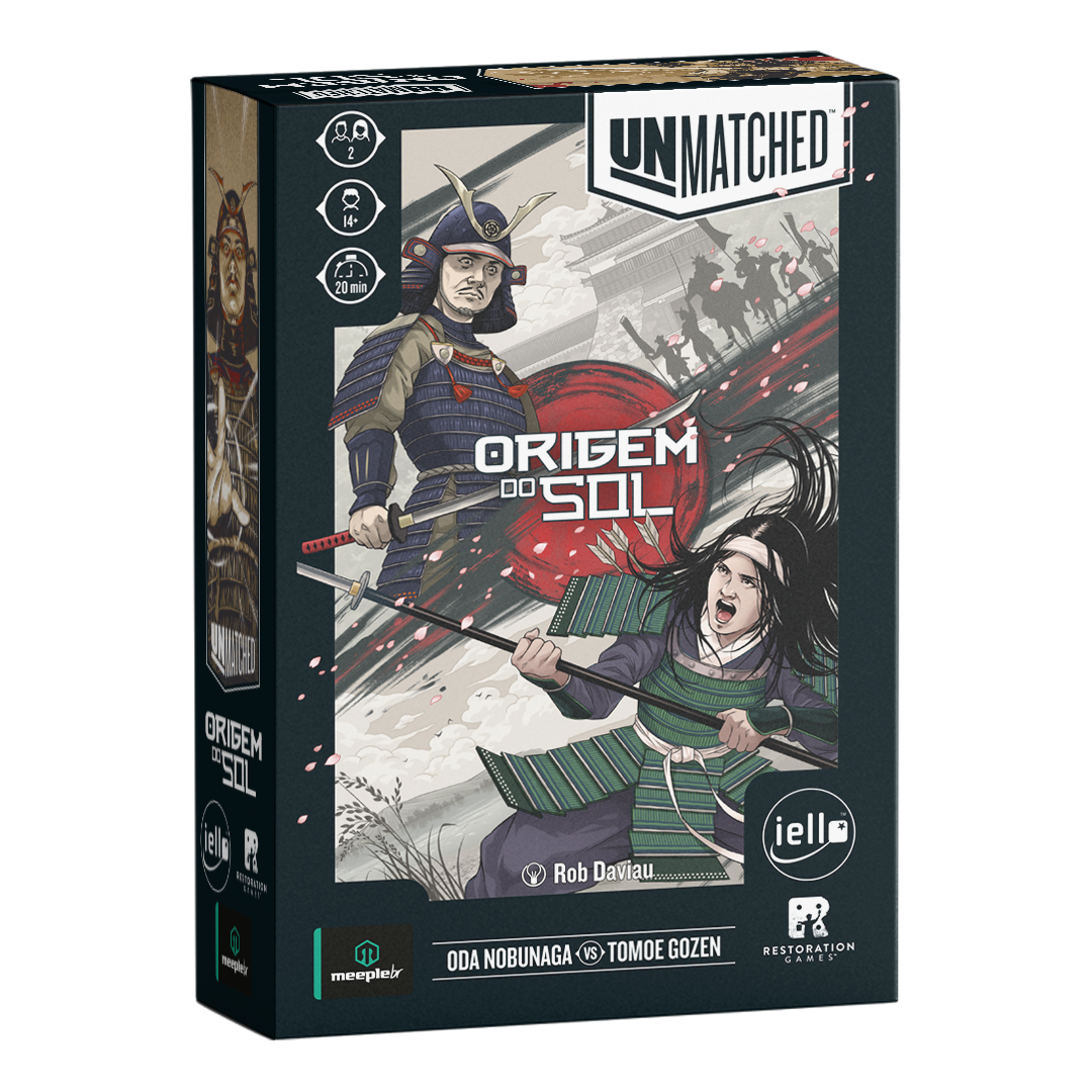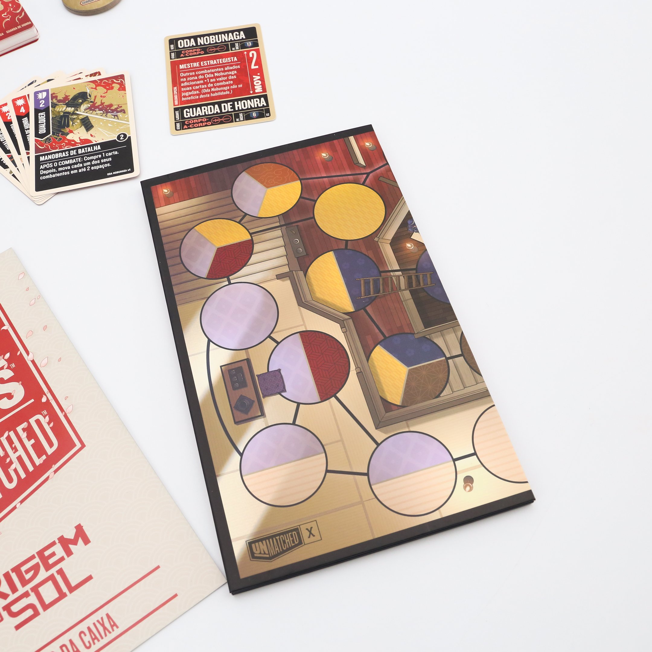 Oda Nobunaga e Tomoe Gozen se enfrentam em mais uma batalha épica, agora elevando o nível do combate Unmatched para terras orientais. O conjunto Unmatched: Origem do Sol apresenta obras de arte impressionantes de Yuta Onoda, com consultoria cultural de Saigo.